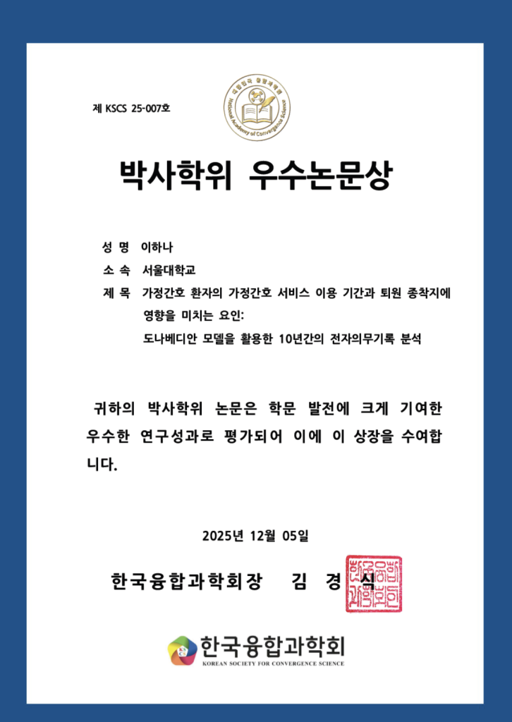 (논문명: 가정간호 환자의 가정간호 서비스 이용 기간과 퇴원 종착지에 영향을 미치는 요인: 도나베디안 모델을 활용한 10년 간의 전자의무기록 분석)